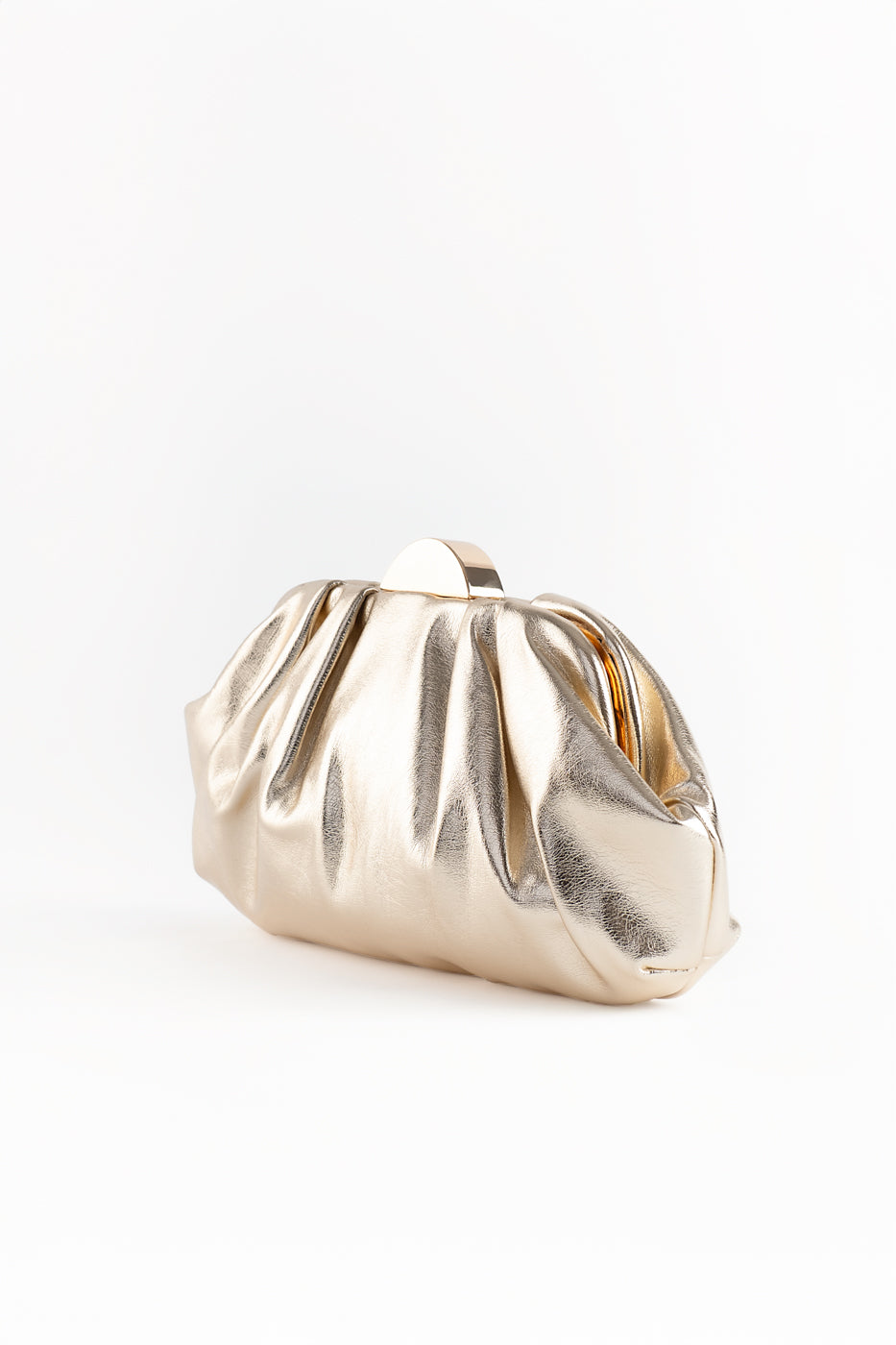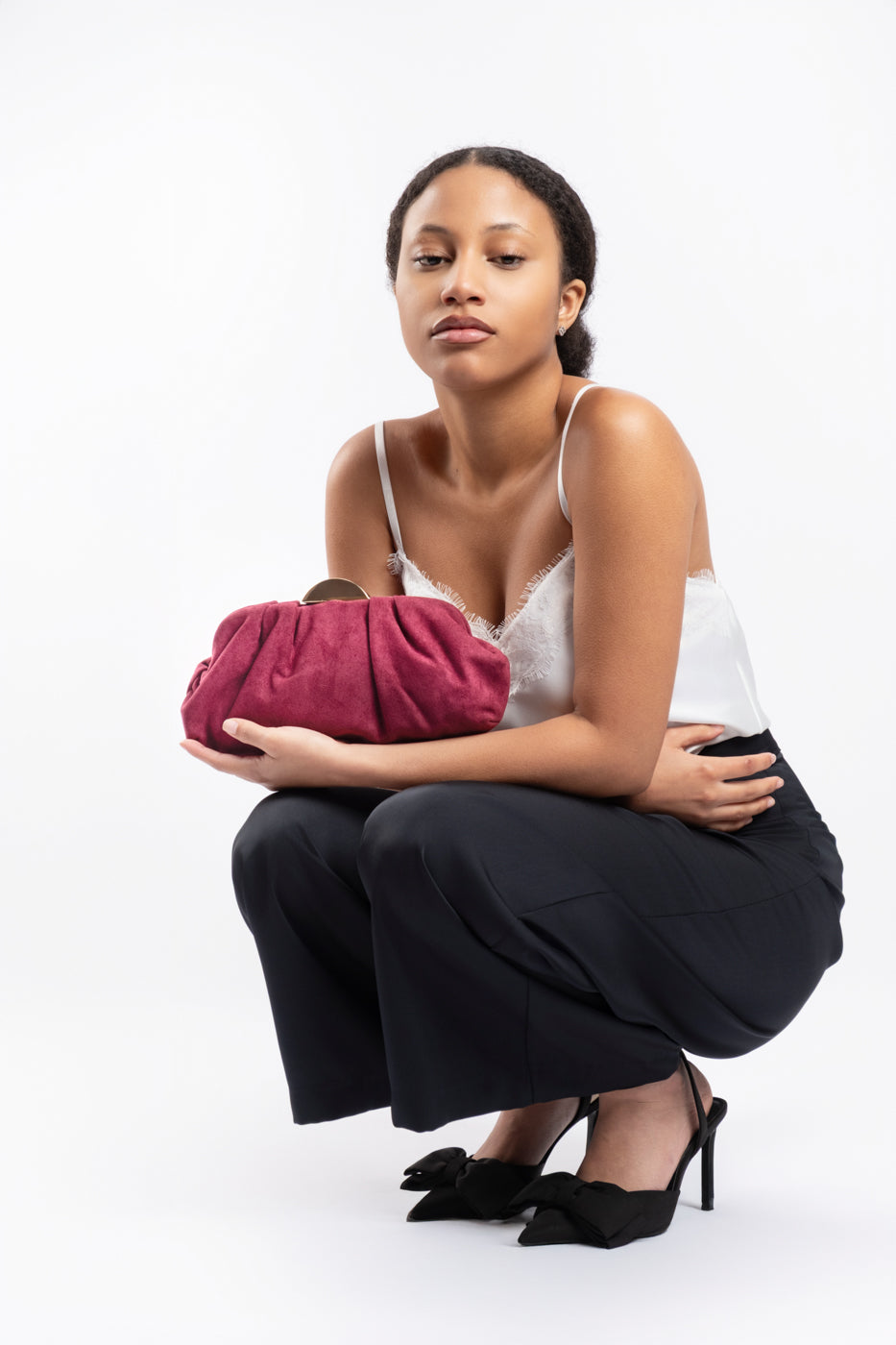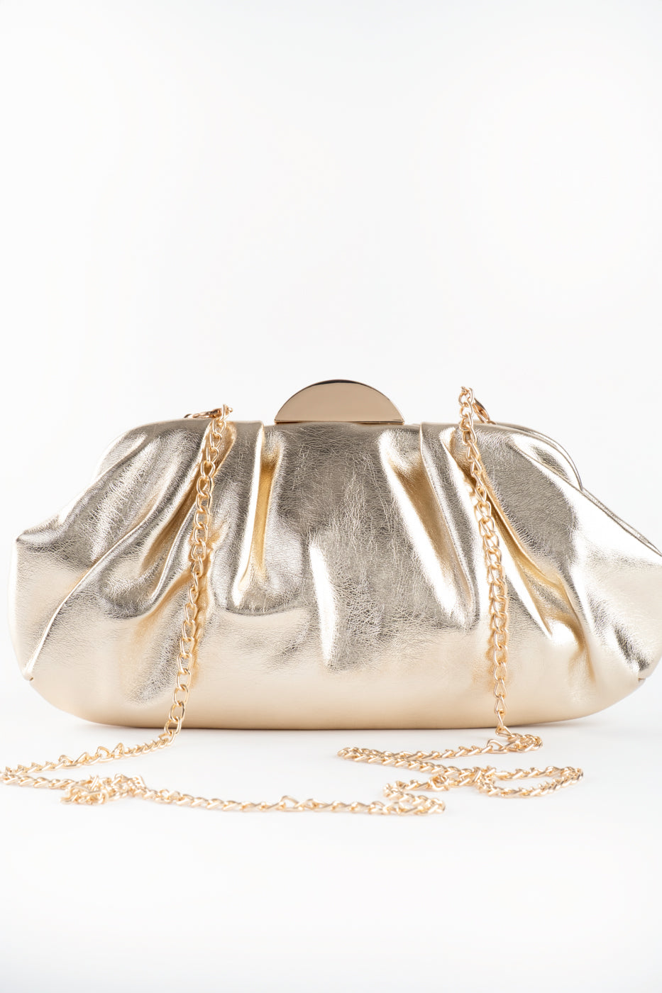 Bolso de fuelle en antelina con cierre dorado. Lleva cadena larga. Disponible en varios colores