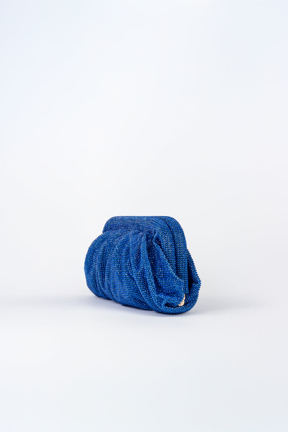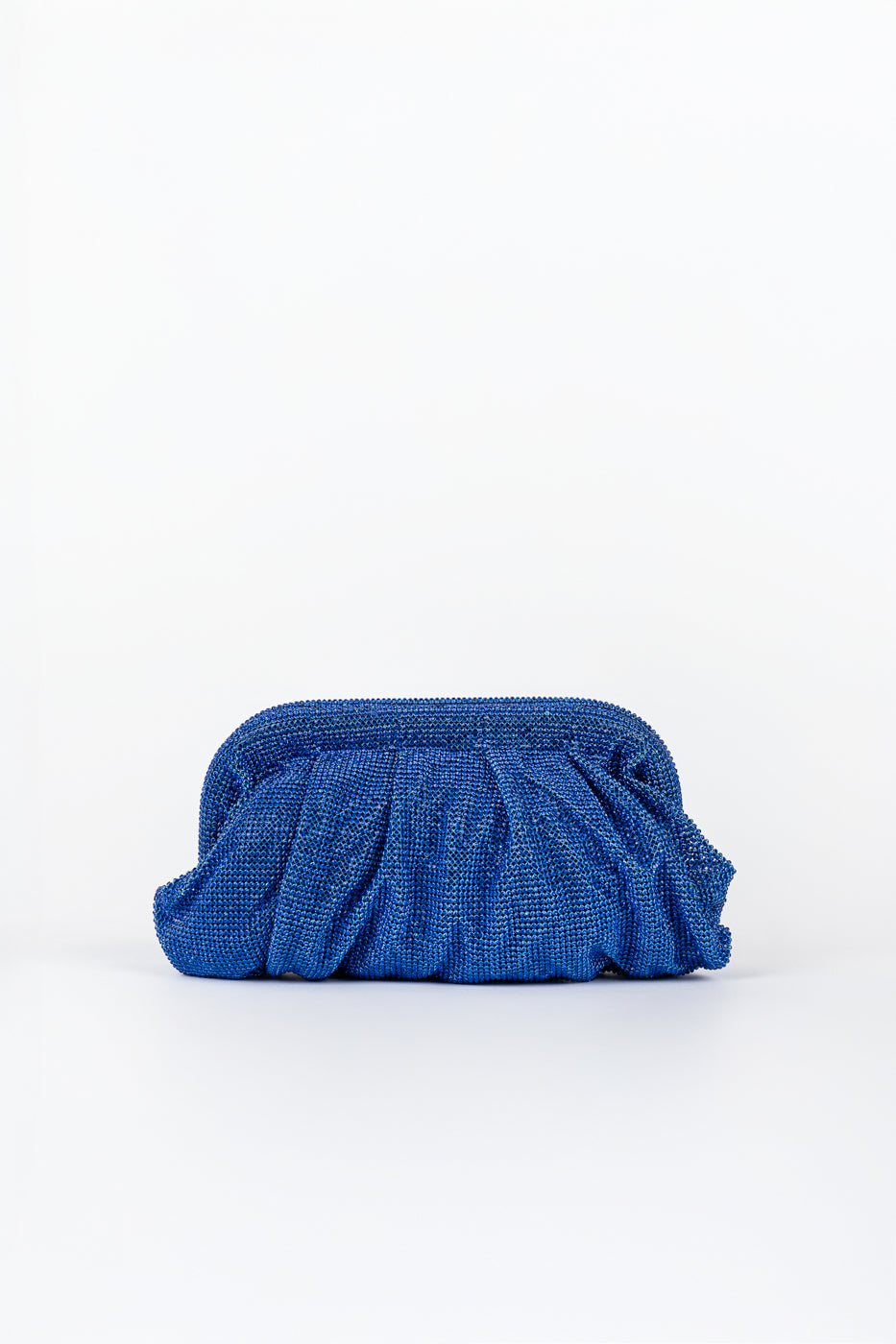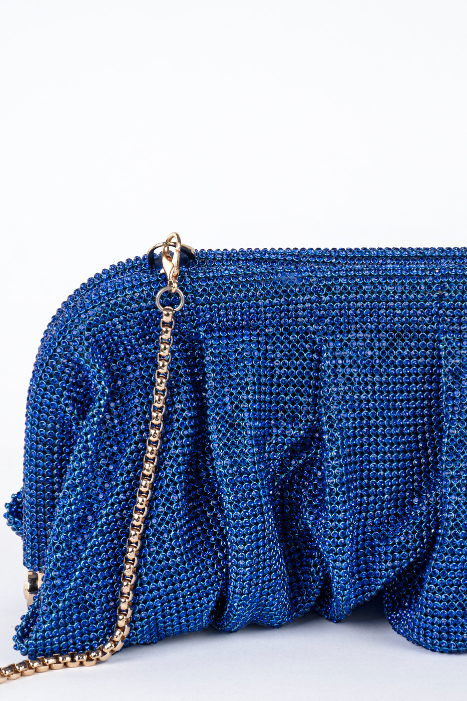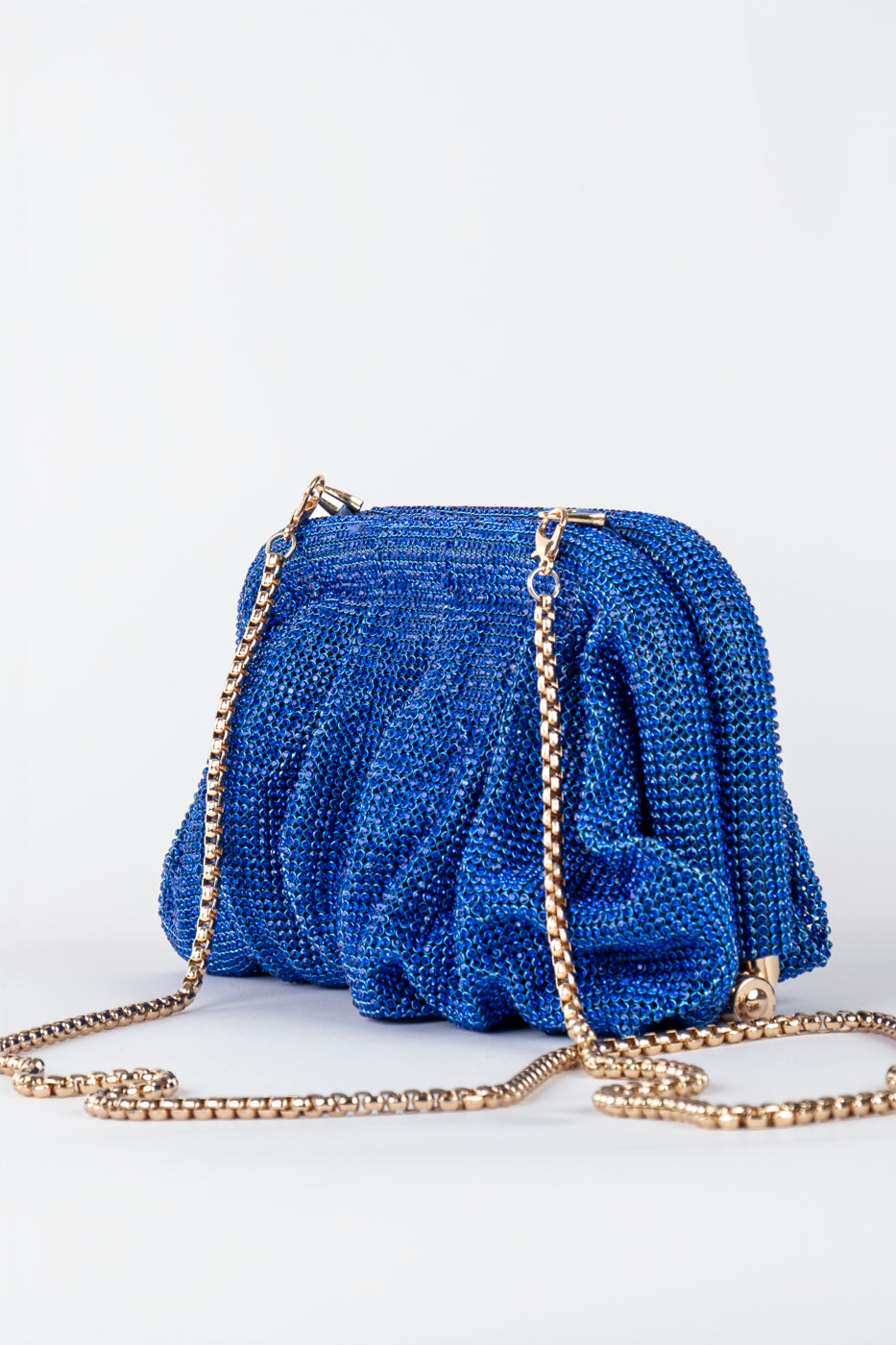 Bolso tipo saca de fuelle cubierto de cristal. Lleva cadena larga. Disponible en varios colores.