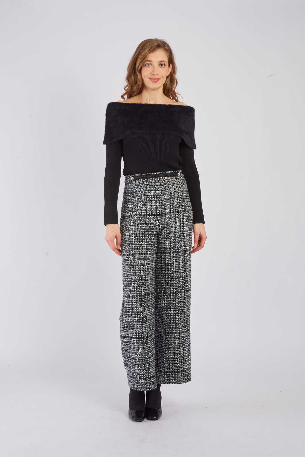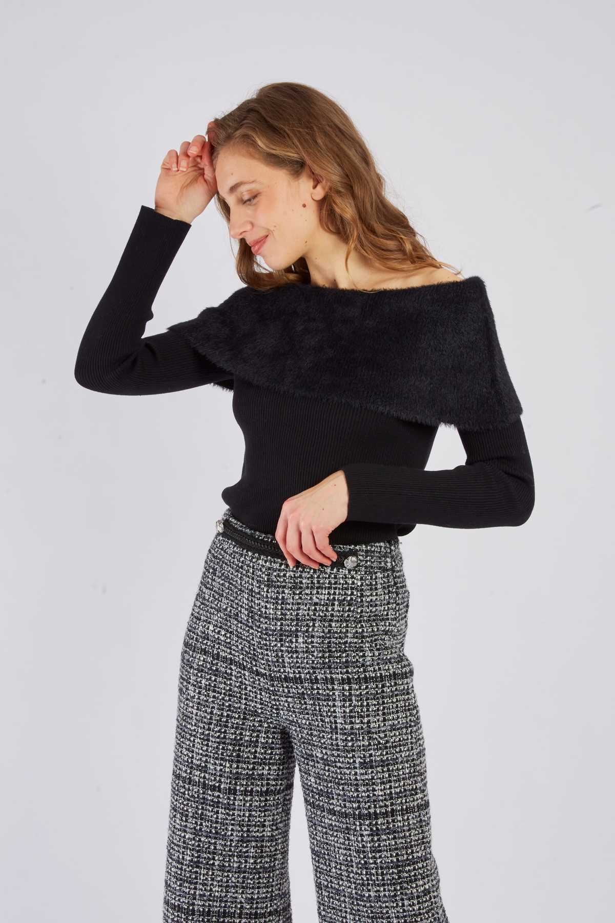 Jersey de cuello bardot con combinado de tejidos y manga larga