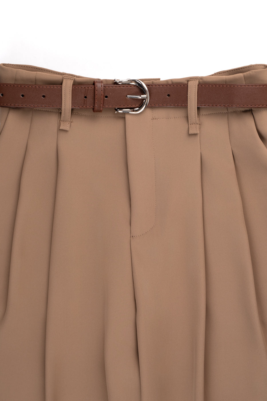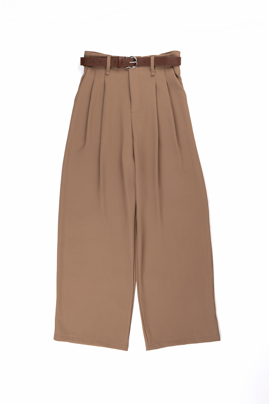 Pantalón fluido largo de pinzas con bolsillos, trabillas, cremallera y cinturón incluido.