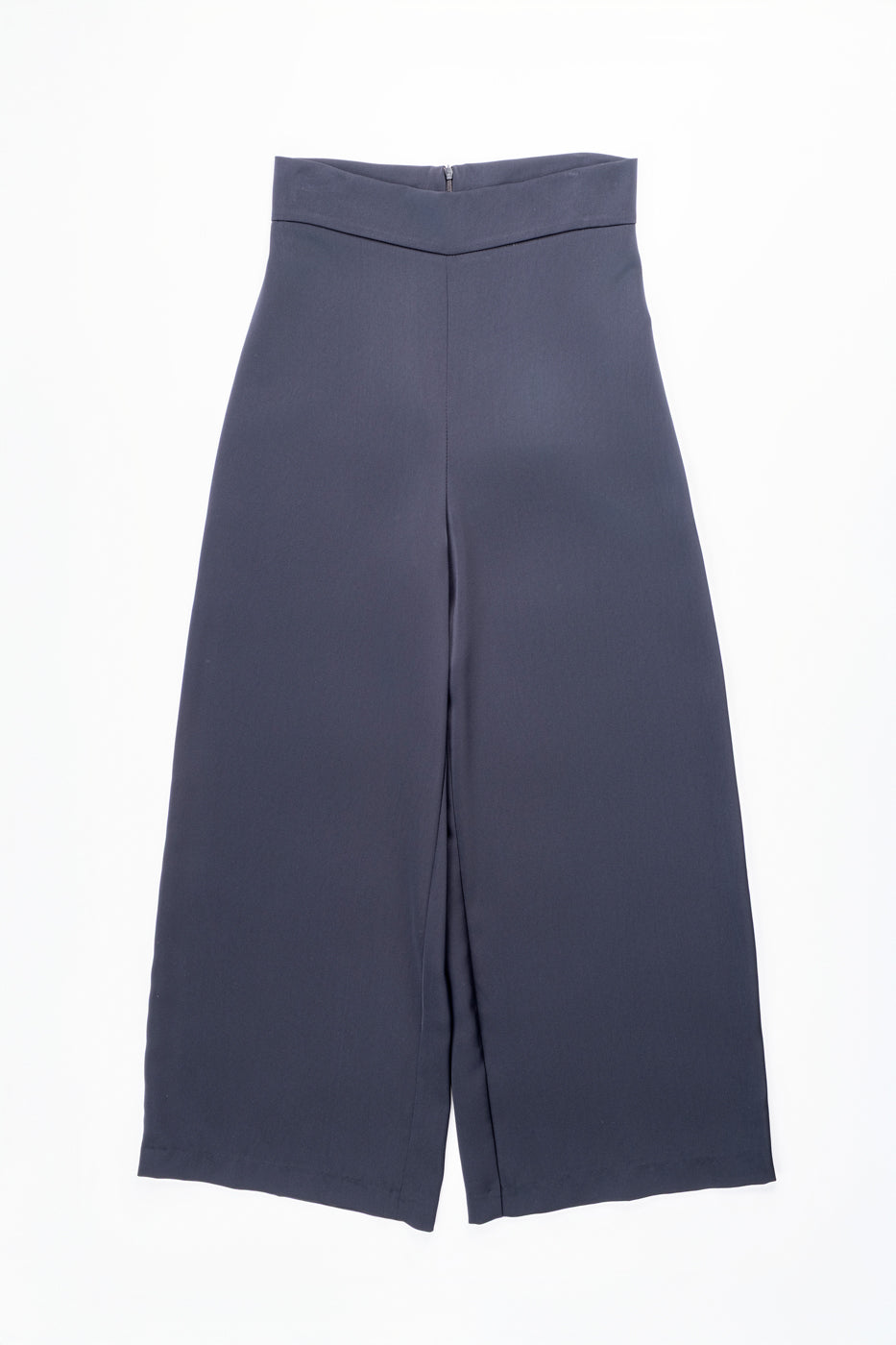 Pantalón fluido con caída de cintura alta y pierna ancha. Lleva cinturilla y cremallera trasera.