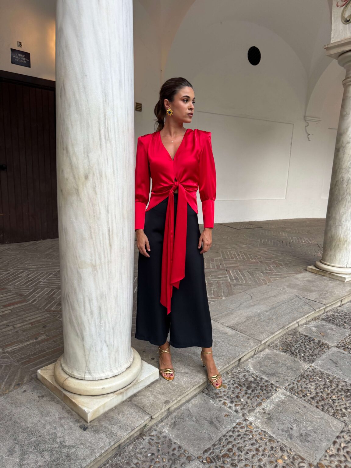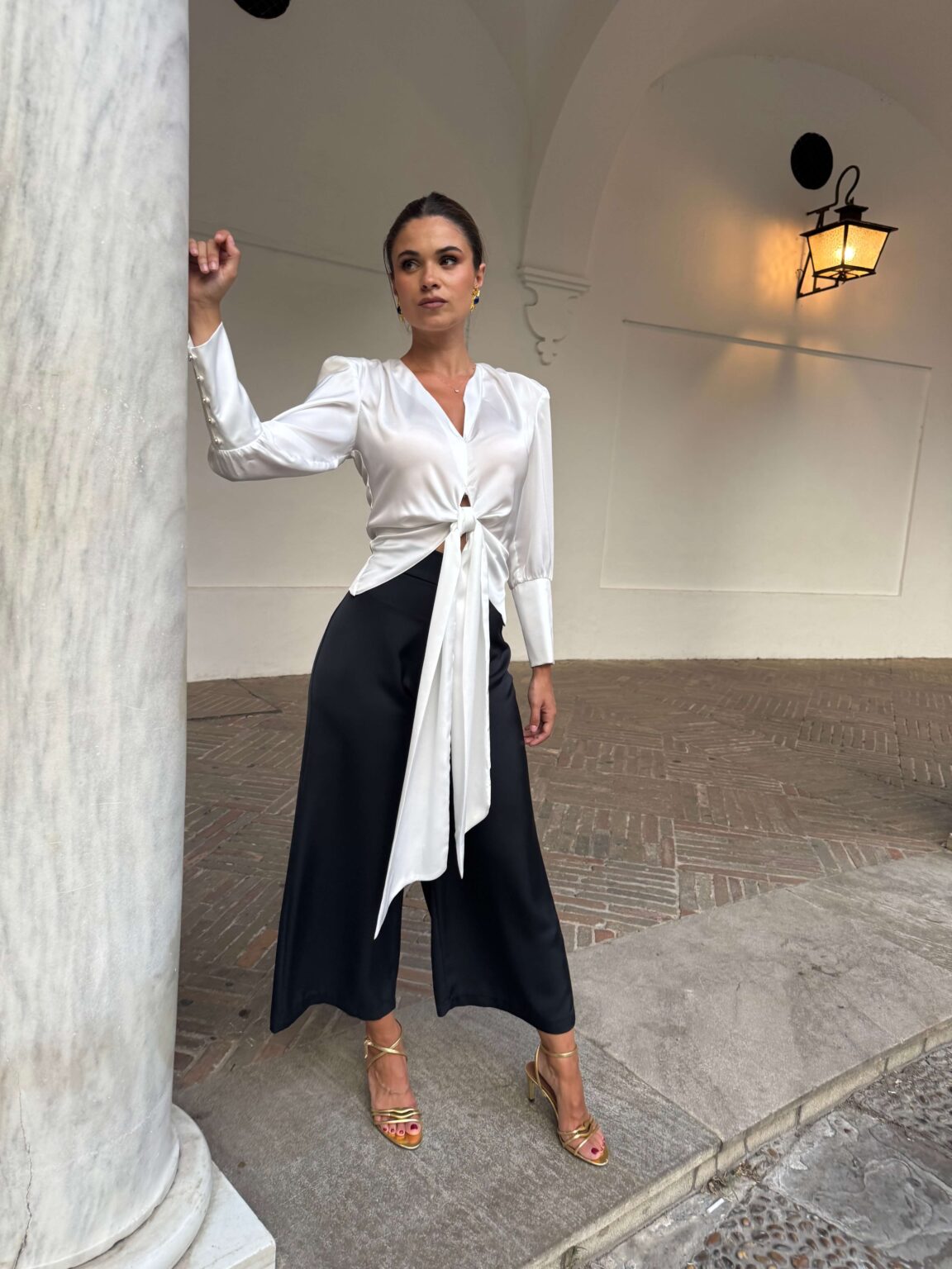 • Pantalón fluido con caída de cintura alta y pierna ancha. Lleva cinturilla y cremallera trasera.