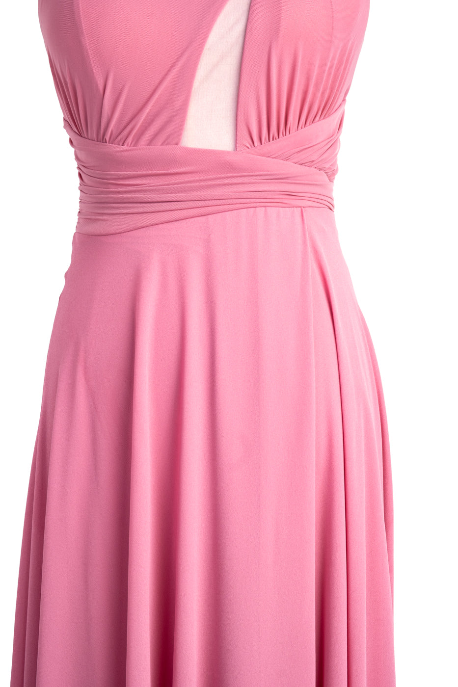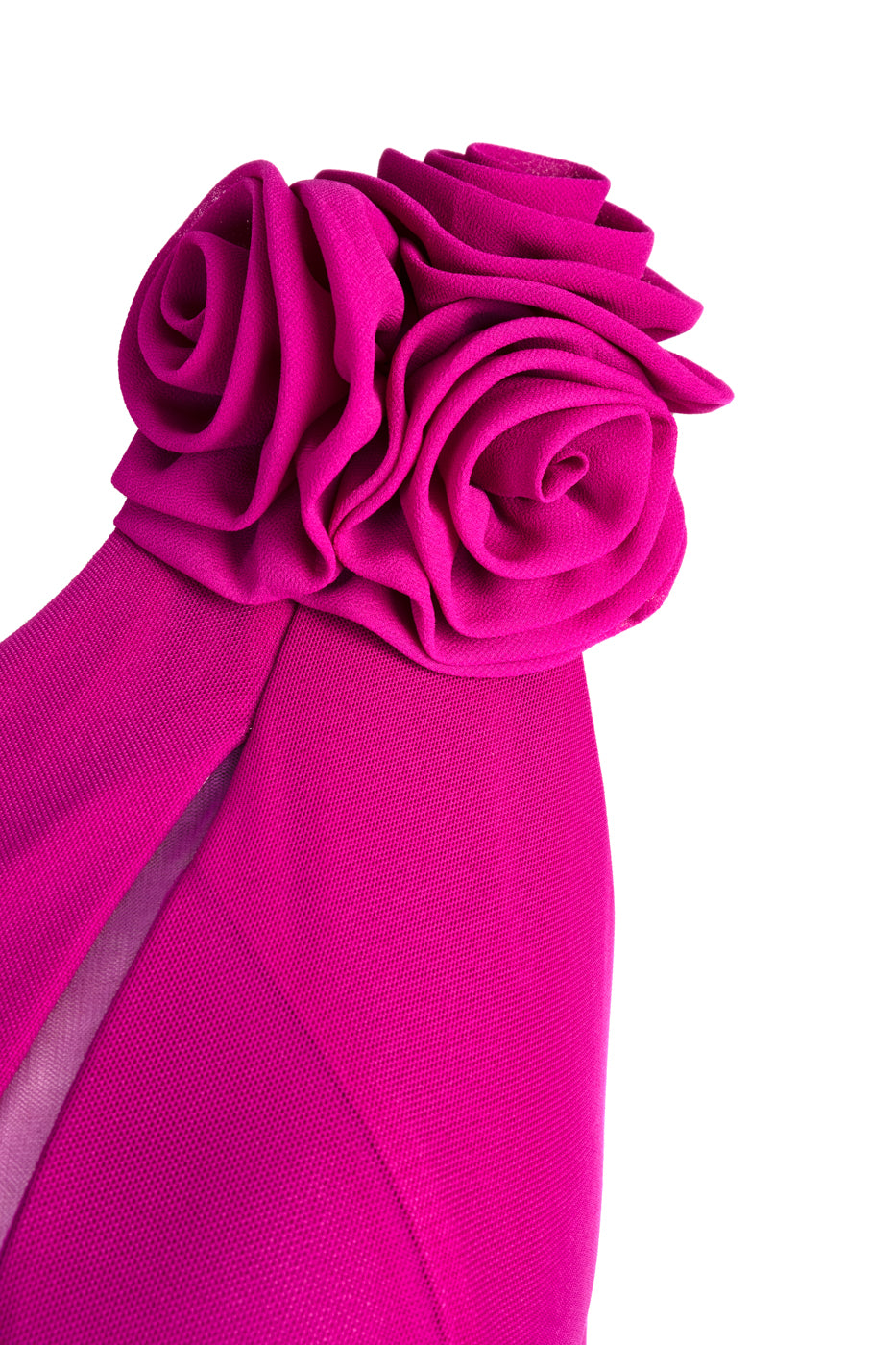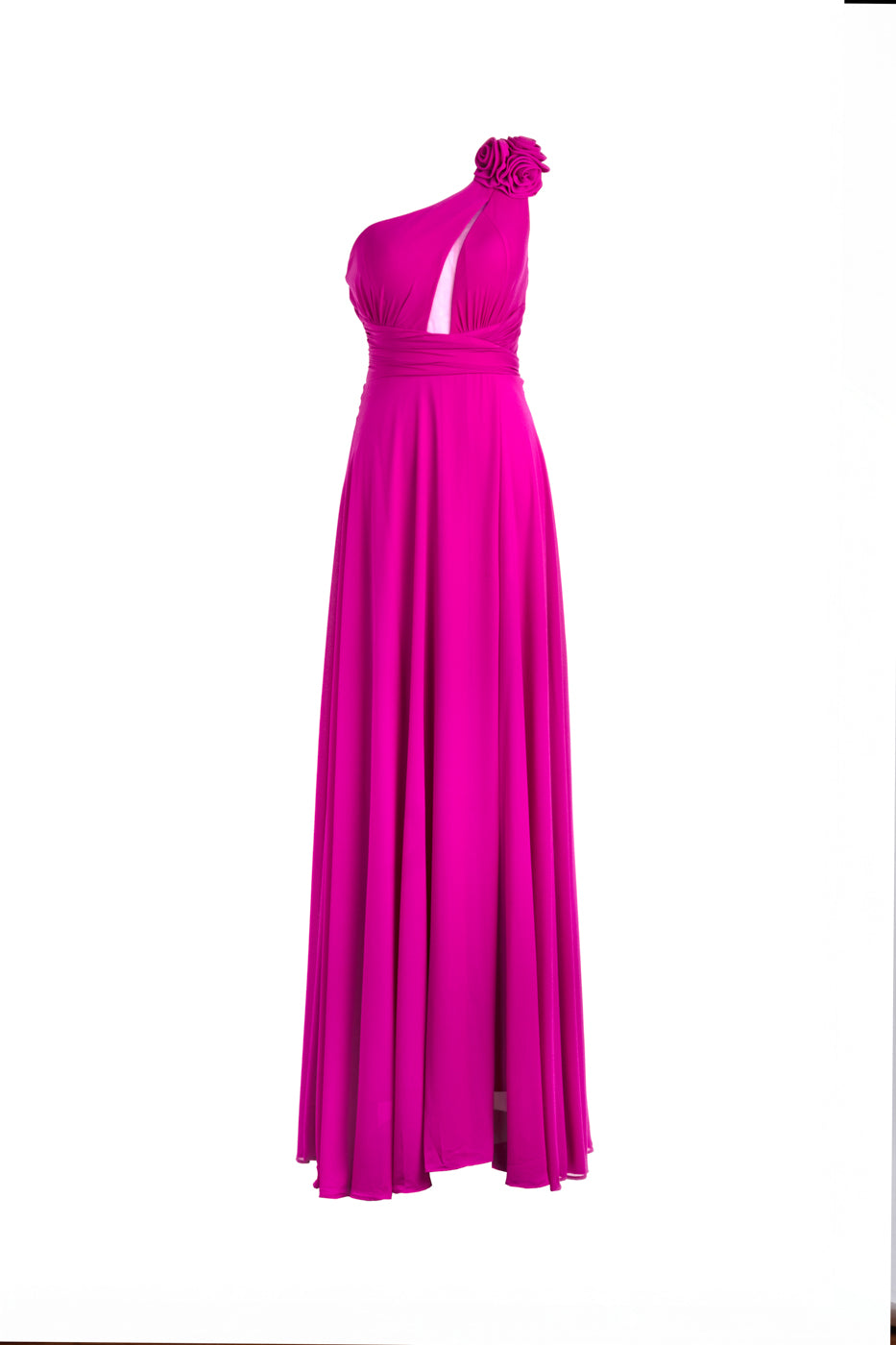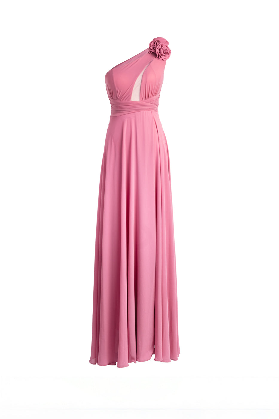 Vestido largo de tul y gasa con cuerpo ajustado, asimétrico y transparencia. La falda lleva abertura y forro. El detalle floral consta de tres flores extraíbles con broche.