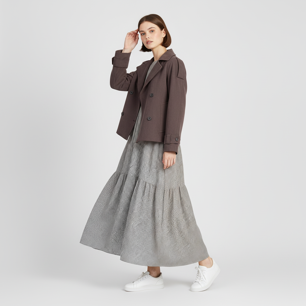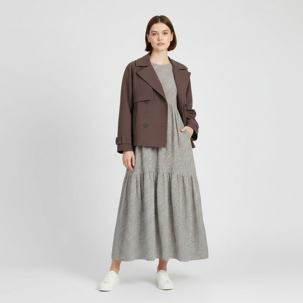 Chaqueta tipo trench con solapas, abotonadura cruzada, bolsillos, forro y cinta de ajuste en mangas.