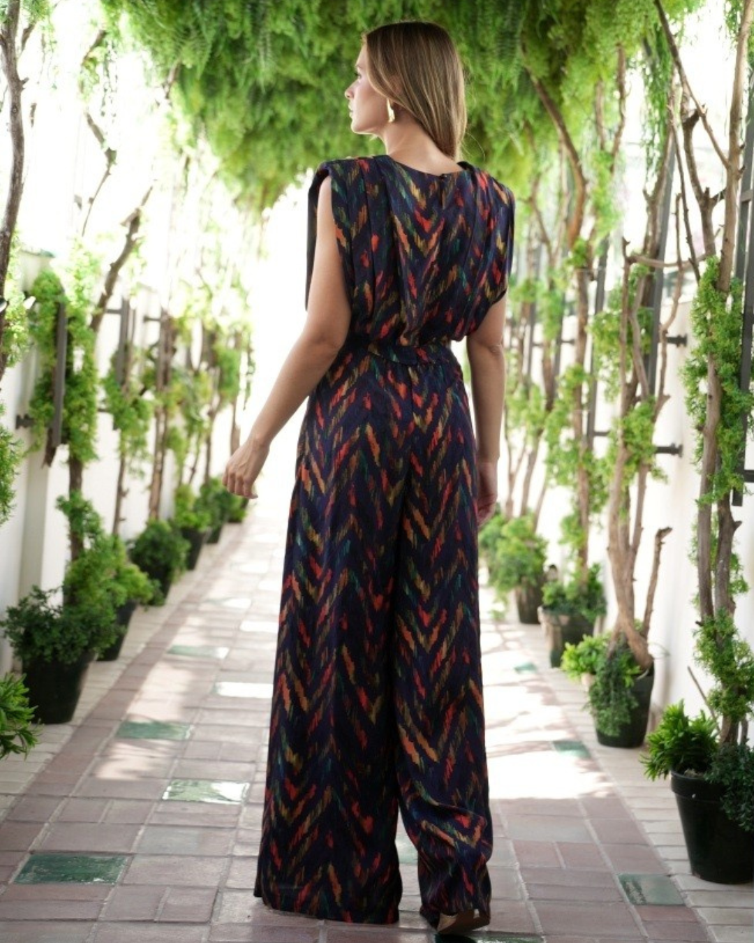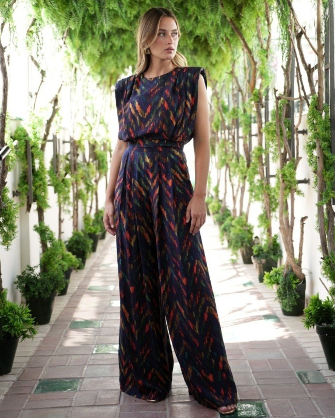Conjunto compuesto por top fluido con detalle de hombreras y pliegues, pantalón de corte palazo con pliegues y goma en espalda para ajustar.