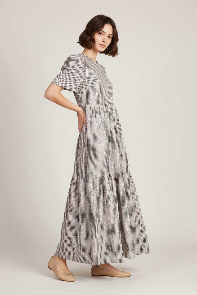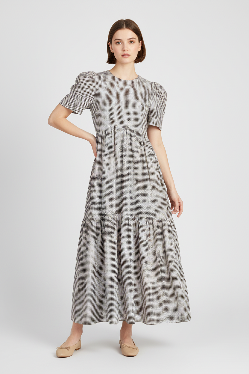 Vestido largo estampado con volantes. Lleva manga abullonada y cremallera trasera.