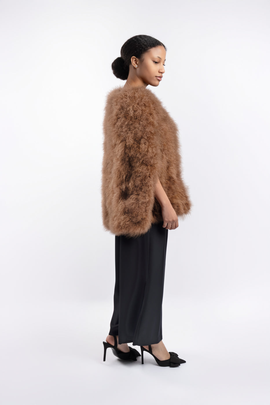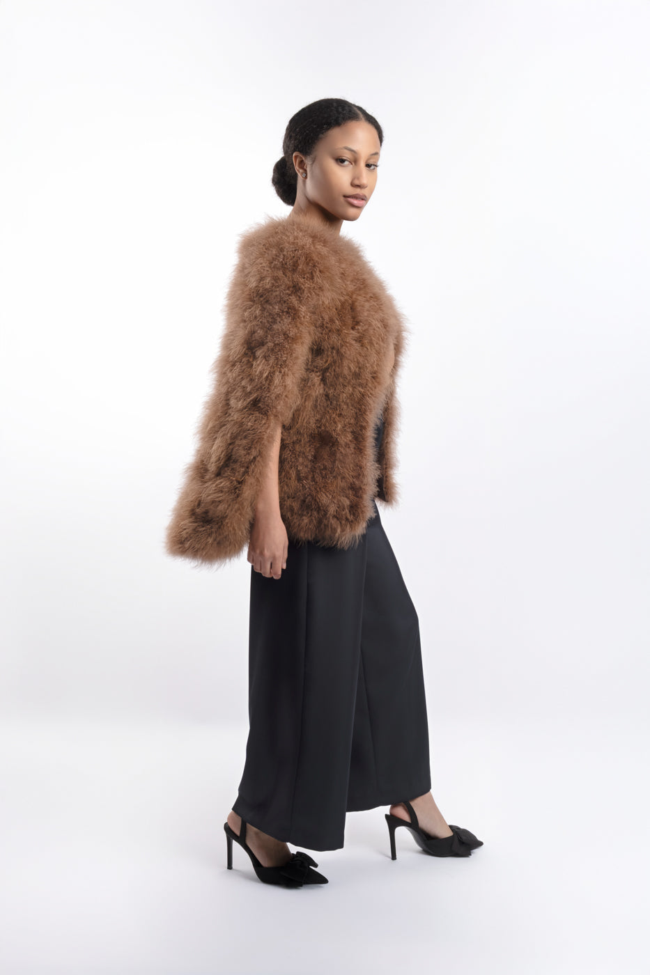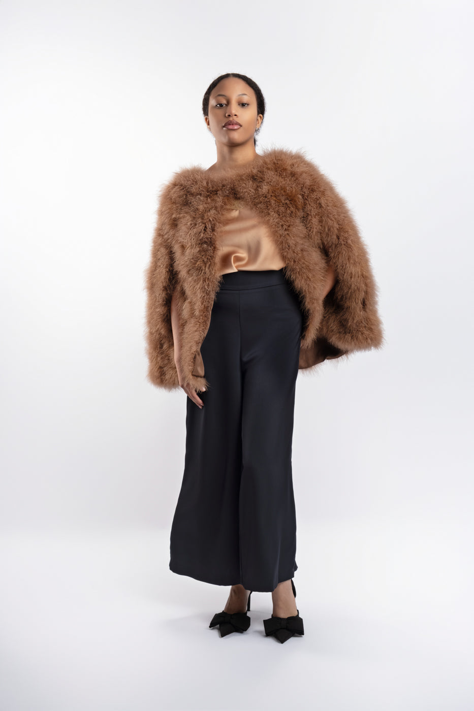 Capa disponible en varios colores. 100% Pluma de Avestruz. Apertura lateral para brazos y broche de cierre en la zona del cuello. Talla única
