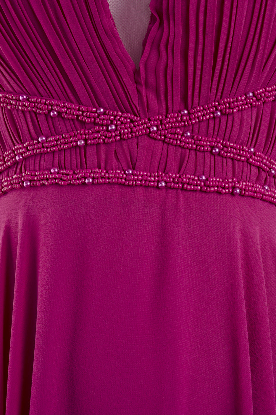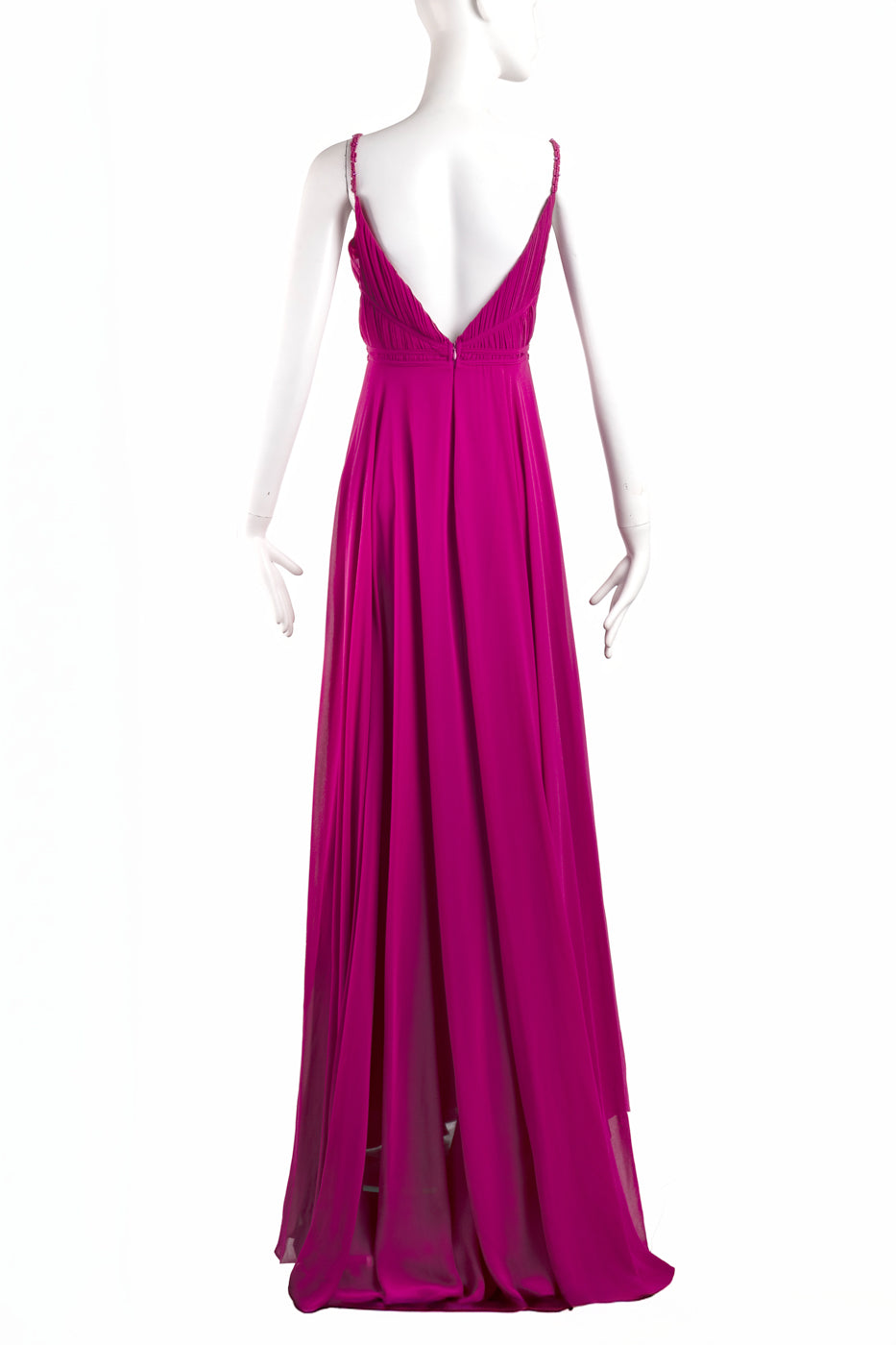 Vestido largo de tul con tiras de canutillo al tono. El escote es plisado y en pico. La espalda es en pico y tiene cremallera trasera.