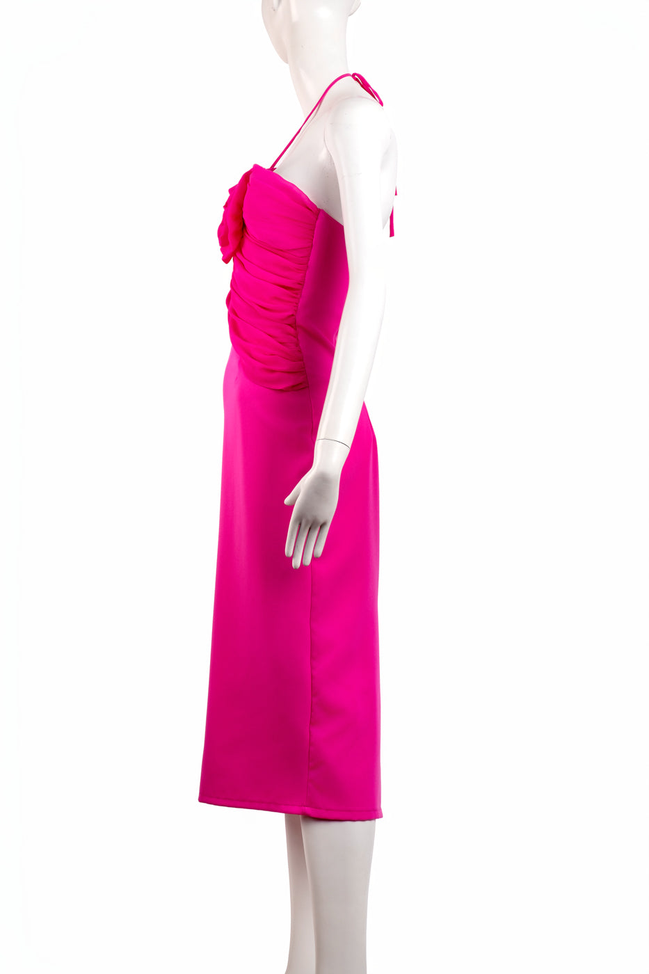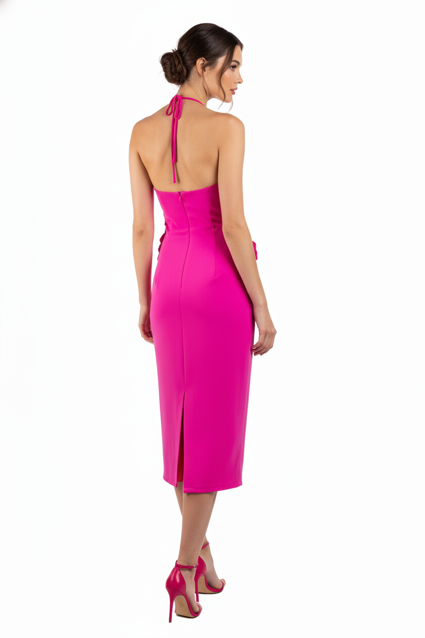 • Vestido con falda recta y cuerpo plisado. Tiene cuello holter y un broche XL en forma de flor.