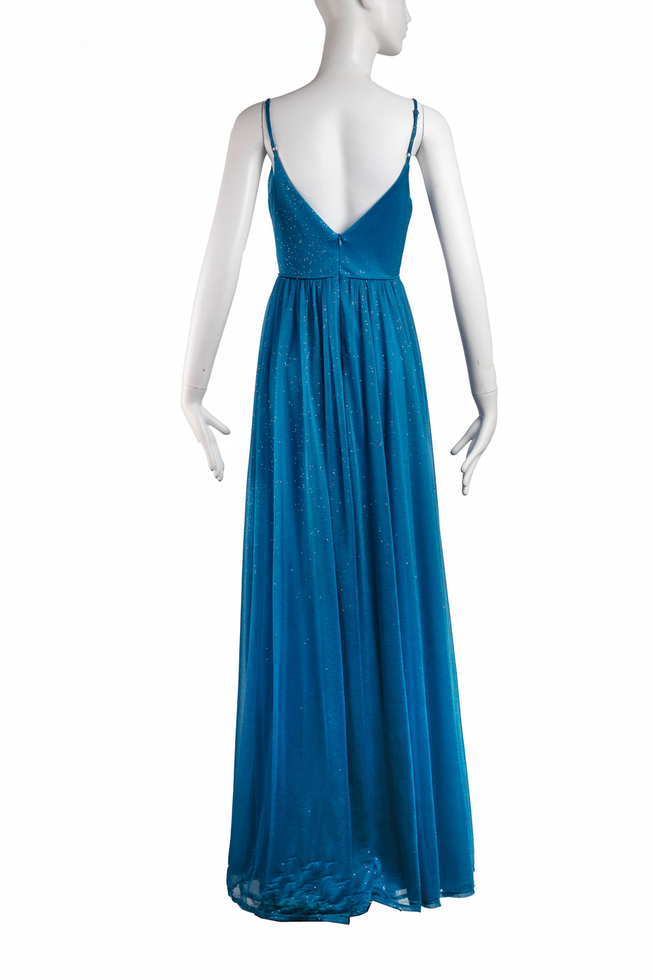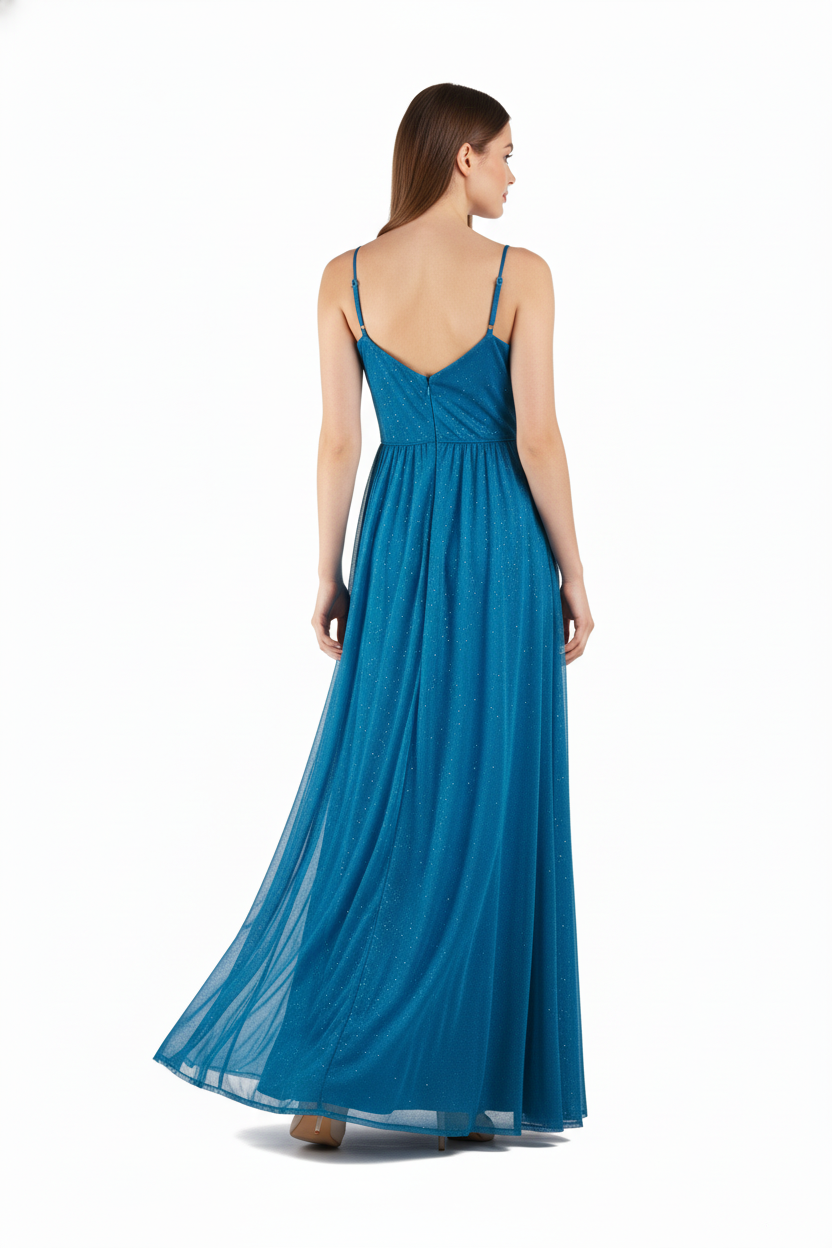 Vestido largo de tirantes con escote plisado en pico y tejido de gasa con brillos. Lleva cremallera.