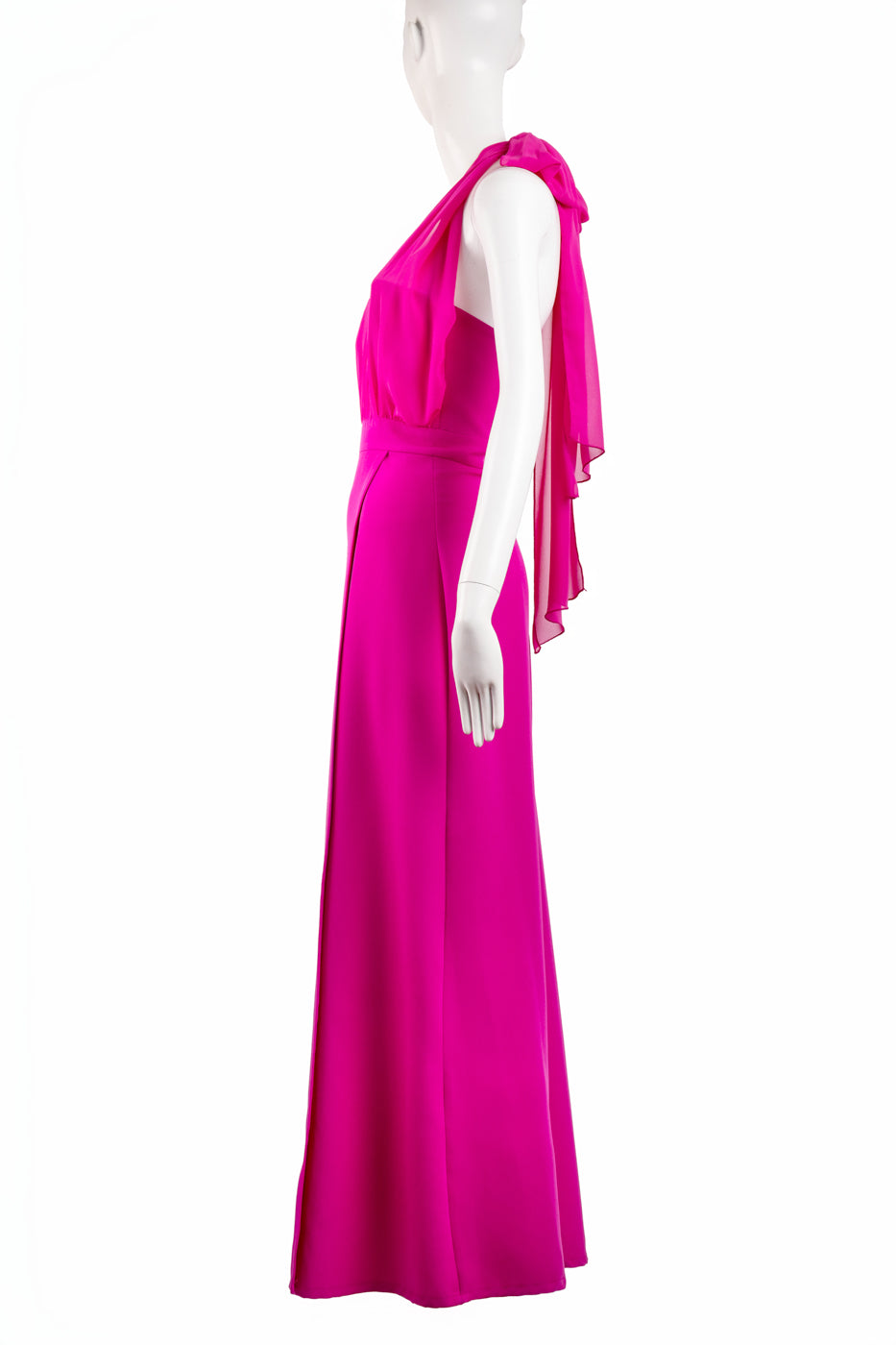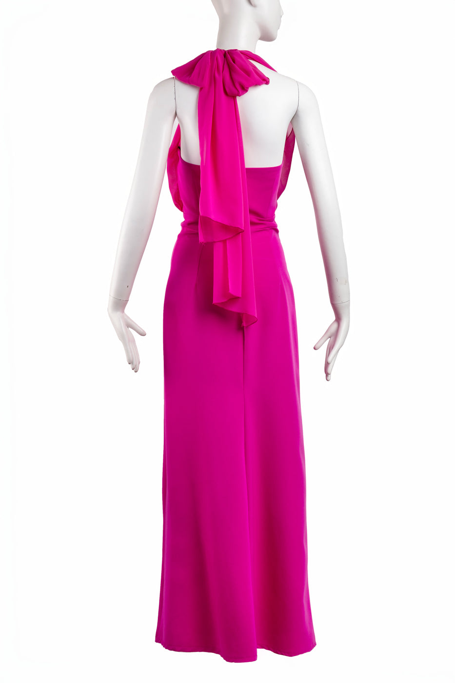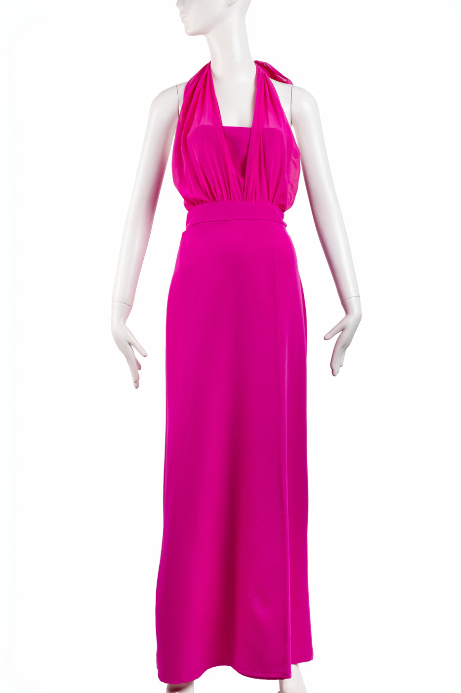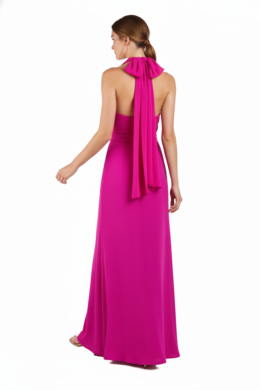 Vestido largo de falda recta con escote en palabra de honor. Tiene una gasa cruzada en el escote con lazada holter XL. Lleva cremallera.