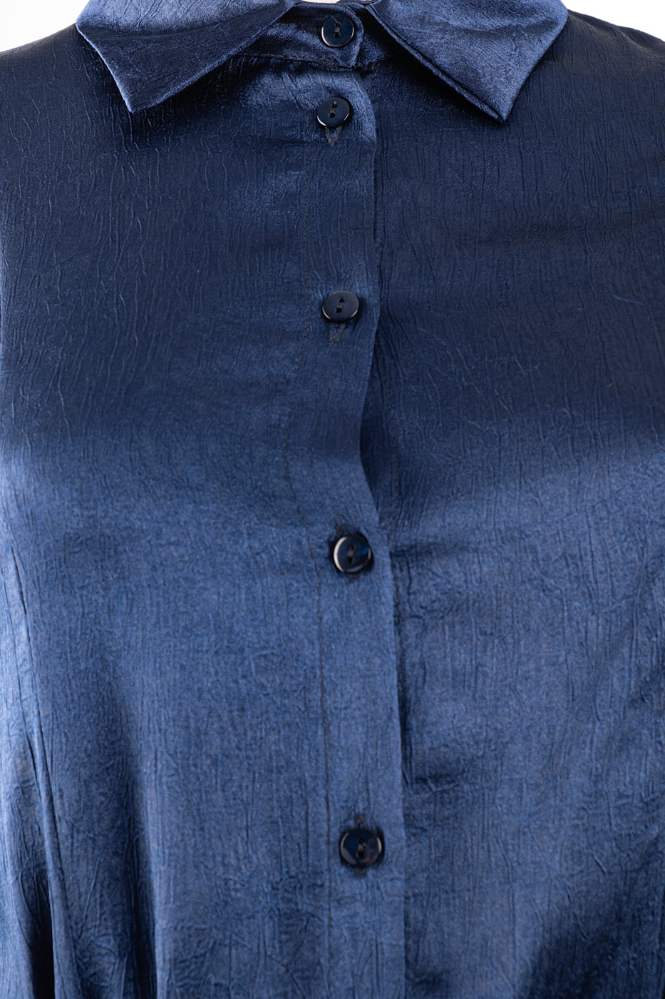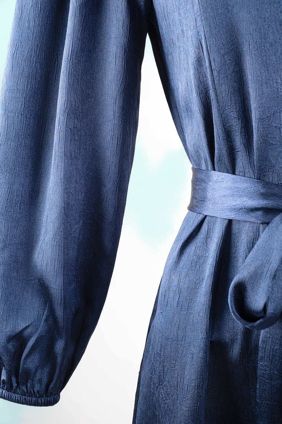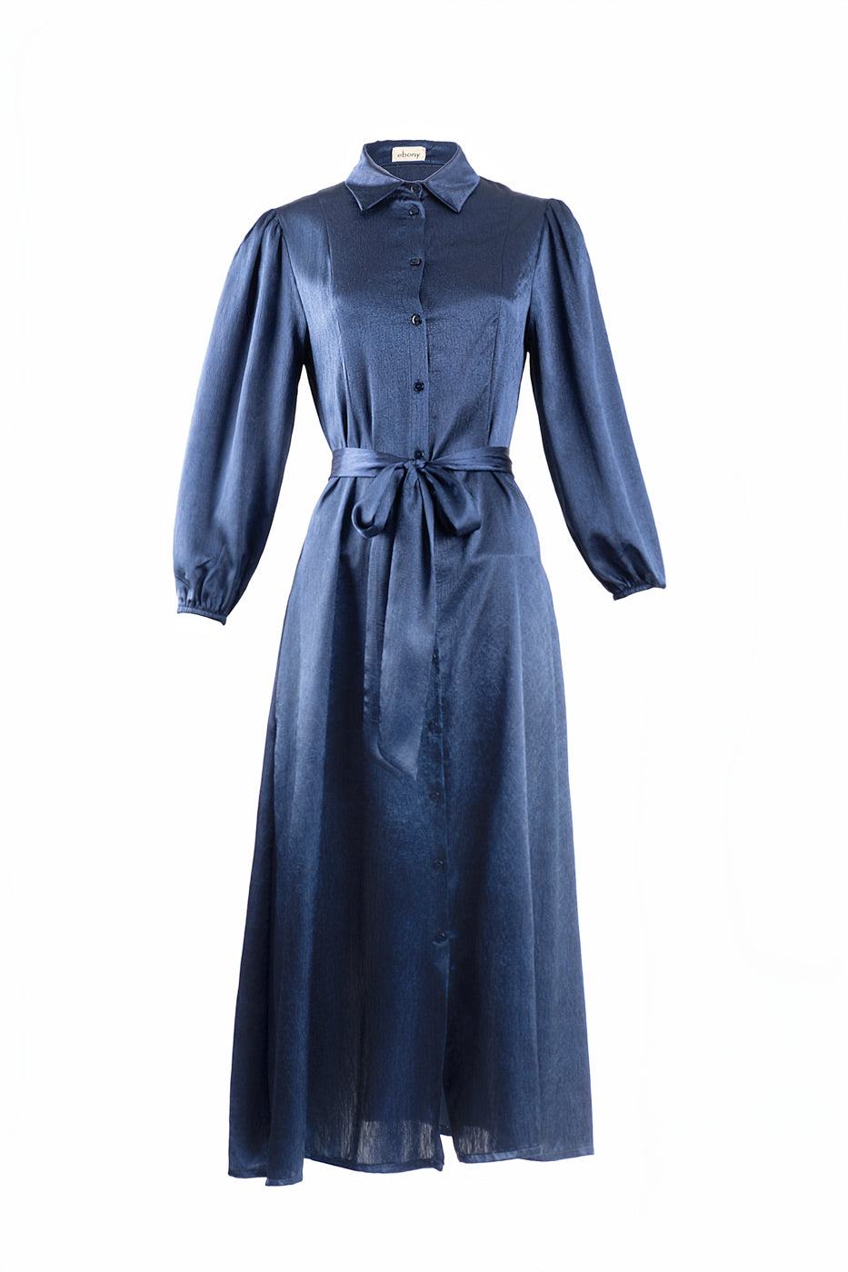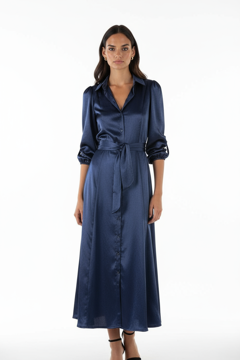Vestido midi confeccionado en tejido de raso. De corte camisero, abotonado con cinturón para ajustar y manga abullonada con elástico.