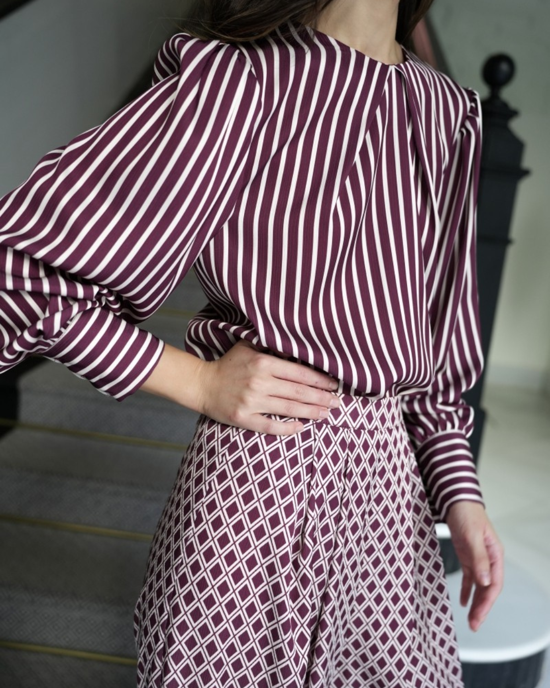 • Blusa confeccionada en un suave tejido con efecto seda con cruce delantero. Su diseño destaca por las mangas con fruncidos que terminan en puños estructurados realzados con detalle dorado.