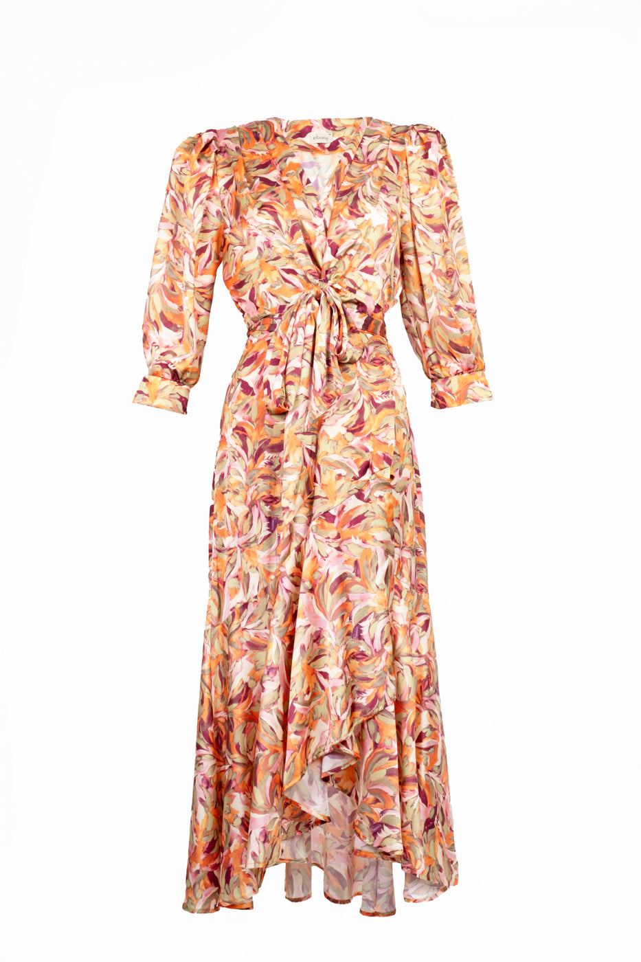Vestido midi para eventos disponible en varios colores. Está realizado en un tejido fluido y con caída, lo que le da mucho movimiento. Lleva hombrera (extraíble), manga francesa abullonada y escote en pico, que se realiza mediante la lazada delantera y la de cierre de cruce del propio vestido. Lleva forro en la parte inferior.